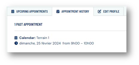 Comme signalé plus haut, l’historique de mes réservations peut être consulté dans le menu APPOINTEMENT HISTORY.