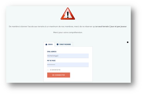 - C’est pourquoi et de manière à donner l’accès aux terrains à un maximum de nos membres, merci de ne réserver qu’un seul terrain / jour et par joueur. Merci pour votre compréhension. Nous comptons d’ailleurs sur le fair-play de chacun pour ne pas réserver des plages horaires se suivant sur le nom du premier joueur, puis du deuxième joueur, etc. En cas d’abus, le Comité se réserve le droit d’intervenir et d’annuler les réservations non conformes.