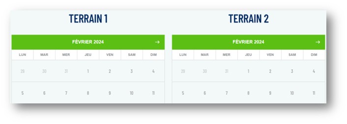 La liste des terrains se trouve en dessous de cette boîte de dialogue. Chaque terrain est complété par un calendrier dont le mois peut être modifié en cliquant sur la flèche de droite.