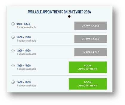 La réservation de 13h30 est disponible et lorsque le curseur est placé sur le bouton vert, celui-ci change de couleur et devient orange. Les boutons gris UNAVAILABLE représentent les périodes réservées ou échues.