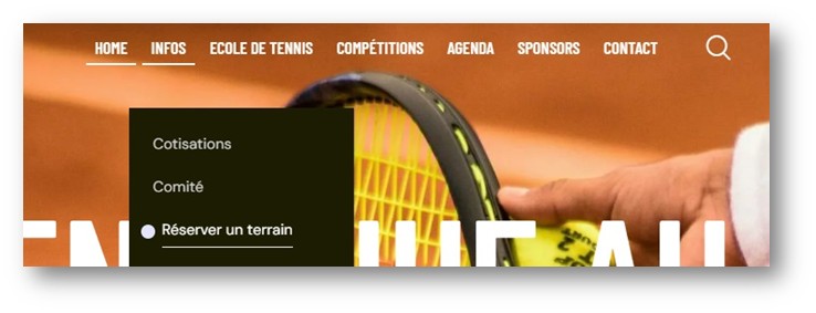 Une deuxième possibilité est de faire glisser le curseur sur le menu INFOS et de choisir la commande Réserver un terrain dans la liste.